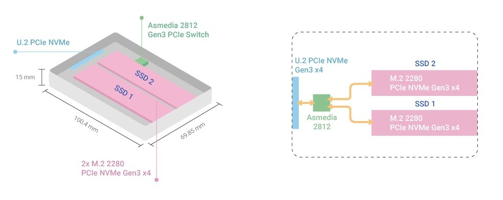 Model QDA-U2MP może pomieścić dwa dyski SSD M.2 PCIe 3.0 x4 NVMe w 2,5-calowej wnęce dysków U.2 (SFF-8639) PCIe 3.0 x4 NVMe SSD. QDA-U2MP nie wymaga użycia...