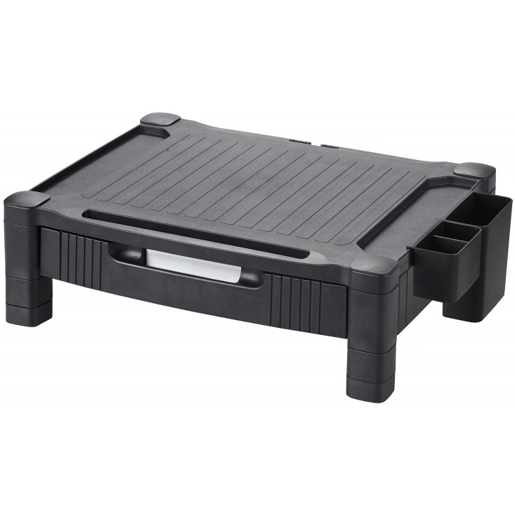 stojak na monitor/drukarkę regulowana wysokość (10,3 i 13,3 cm) wyposażony w bardzo szeroką platformę antypoślizgową posiada szufladę z 2 przegrodami i 2 ruchome przegrody boczne pod podstawą monitora można umieścić standardową klawiaturę schowek na kable z tyłu wymiary: 43,4x33,6x13,3cm maksymalna waga: 20 kg kolor: czarny