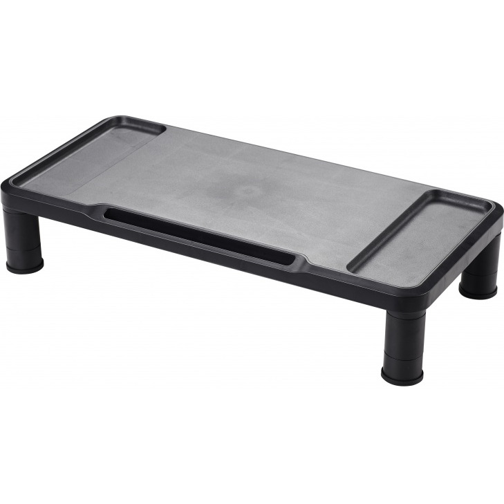 Plastikowy stojak na monitor Q-Connect regulowany na 3 wysokościach (6,2/8,2/11,2cm) Posiada przegródkę na telefon/tablet lub długopisy Wymiary powierzchni: 55,5 x 26,5cm Obciążenie maks. 15kg. Kolor czarny