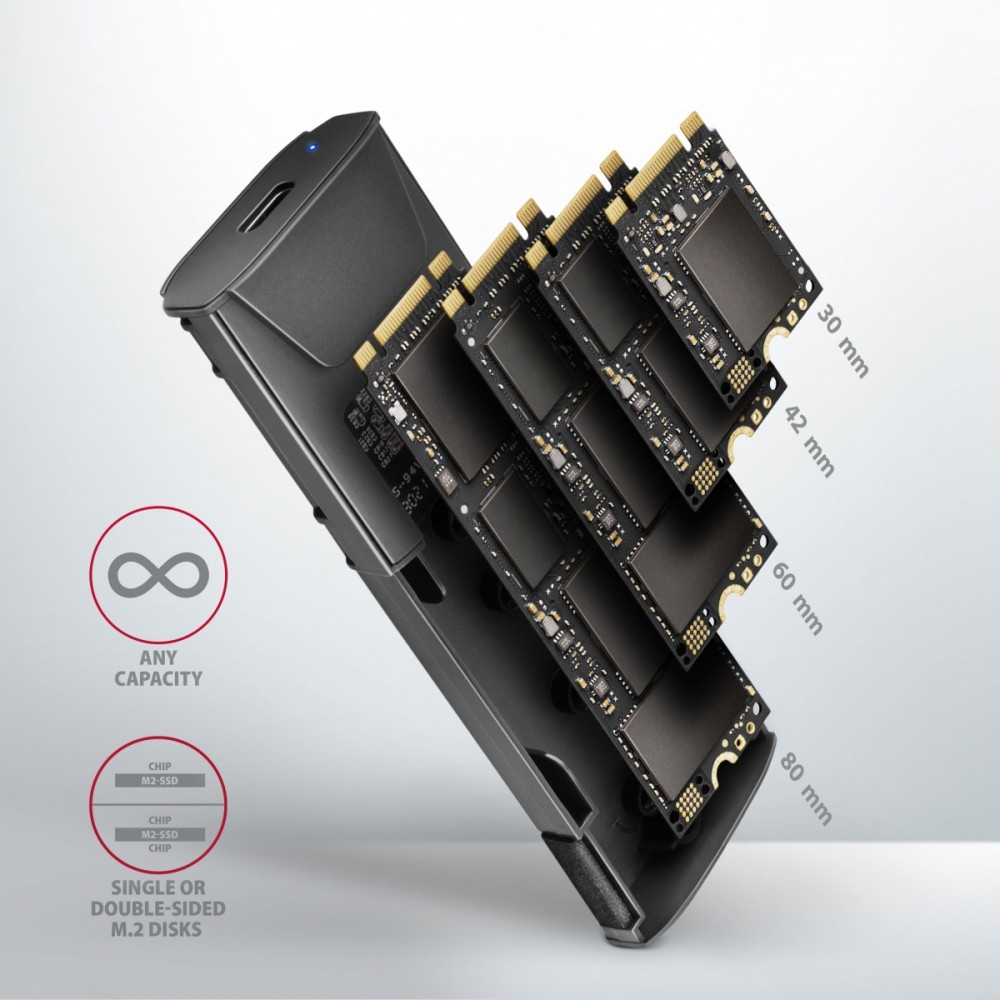 W zewnętrznej obudowie można zastosować dysk SSD NVMe M.2 do 22x80 mm. Obudowa nie ma ograniczenia pojemności dysków SSD. Karty M.2 mogą być jednostronne lub dwustronne. Wkładając dysk M.2 SSD do pudełka, można stworzyć szybki i kompaktowy dysk zewnętrzny. Obudowa może być używane z komputerami i notebookami, jak również z telefonami komórkowymi i tabletami.