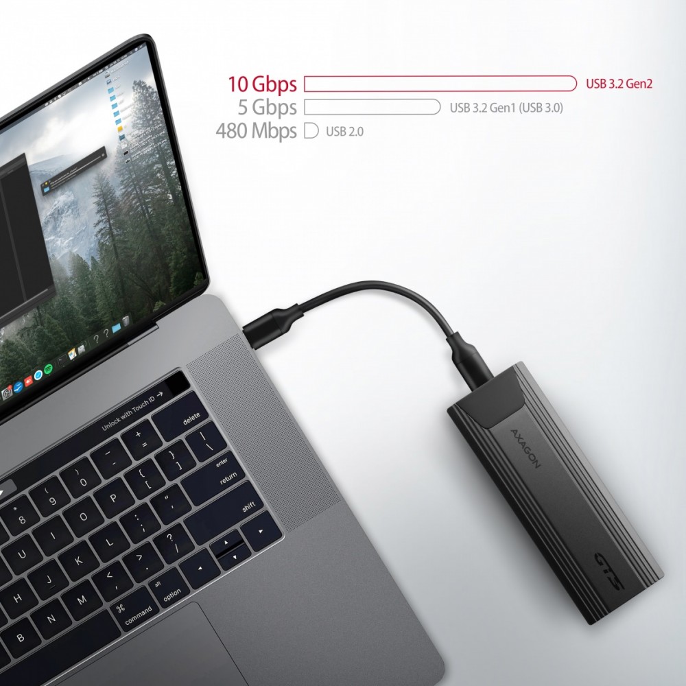 Superszybki zewnętrzny AXAGON EEM2-GTS THIN SCREWLESS box z interfejsem USB 3.2 Gen 2 jest przeznaczony dla dysków NVMe (PCI-Express) M.2 SSD. Dwustronne złącze USB-C na obudowie wraz z dołączonym kablem USB-C USB-C umożliwia niezawodne połączenie z komputerem. W opakowaniu znajdziesz również kabel USB-C USB-A.