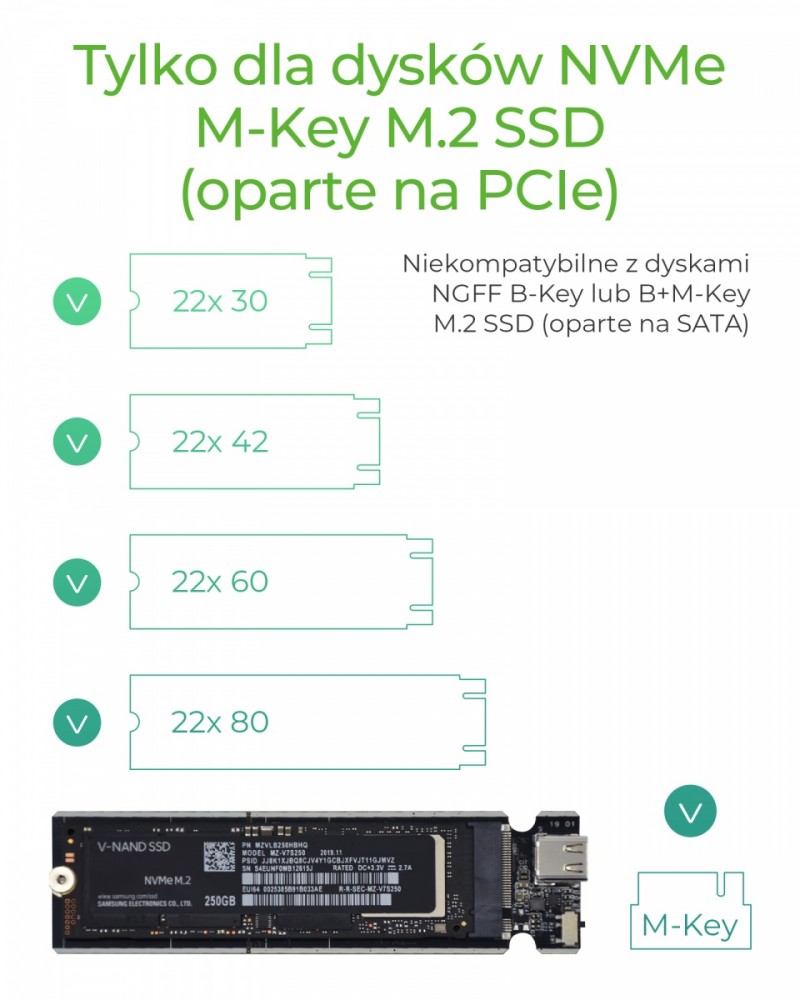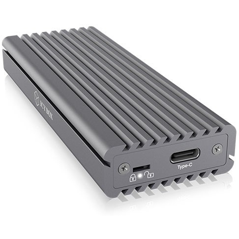 Cechy: Interfejs do komputera hosta: USB 3.1 (Gen 2) Type-C, do 10 Gbit / s Obsługuje szybkość transferu PCIe 3.0 x2 do 1000 megabajtów na sekundę Gniazdo M-Key na dyski SSD NVMe, 22x 30/ 42/60/80 mm Oferuje dodatkowy opatentowany radiator i podkładkę termiczną wewnątrz Dioda LED informująca o zasilaniu i dostępie do dysku Aktywacja ochrony przed zapisem za pomocą przełącznika