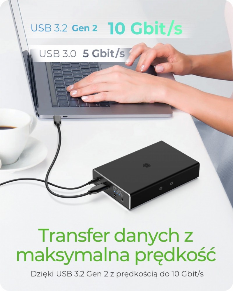 Transfer danych z najwyższą prędkością: dzięki USB 3.2 Gen 2 możesz cieszyć się transferem danych z prędkością do 10 Gbit/s. Dane dowolnej wielkości są przesyłane na dyski w ciągu kilku sekund i można je równie szybko odzyskać.