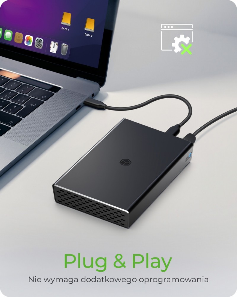 Cicha praca: dzięki konstrukcji bez wentylatora obudowa działa całkowicie bezgłośnie. Dzięki wydajnym właściwościom rozpraszania ciepła przez aluminiową obudowę, Twoje dyski pozostają w optymalnej temperaturze.