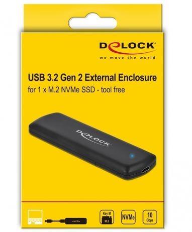 Ta obudowa firmy Delock umożliwia instalację dysków SSD M.2 PCIe NVMe w formacie 2280, 2260, 2242 lub 2230, można ją podłączać poprzez USB do komputera osobistego lub laptopa. Obudowa metalowa z zapewnia właściwą temperaturę pamięci. Cechą wyróżniającą obudowy jest, że do instalacji M.2 SSD nie potrzeba żadnych narzędzi. Pokrywkę można niewielkim naciskiem popchnąć do tyłu, SSD będzie zamocowane do PCB dociskiem gumowym. Pokrywkę docisnąć aż się zatrzaśnie.