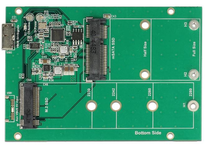 Ten konwerter firmy Delock umożliwia podłączanie dysków SSD M.2 w formacie 2280, 2260, 2242 oraz 2230 lub dysków SSD mSATA o połówkowym lub pełnym rozmiarze. Jeżeli oba gniazda są zajęte, można używać jedynie dysku SSD M.2. Ten konwerter można instalować w systemie poprzez złącze USB.