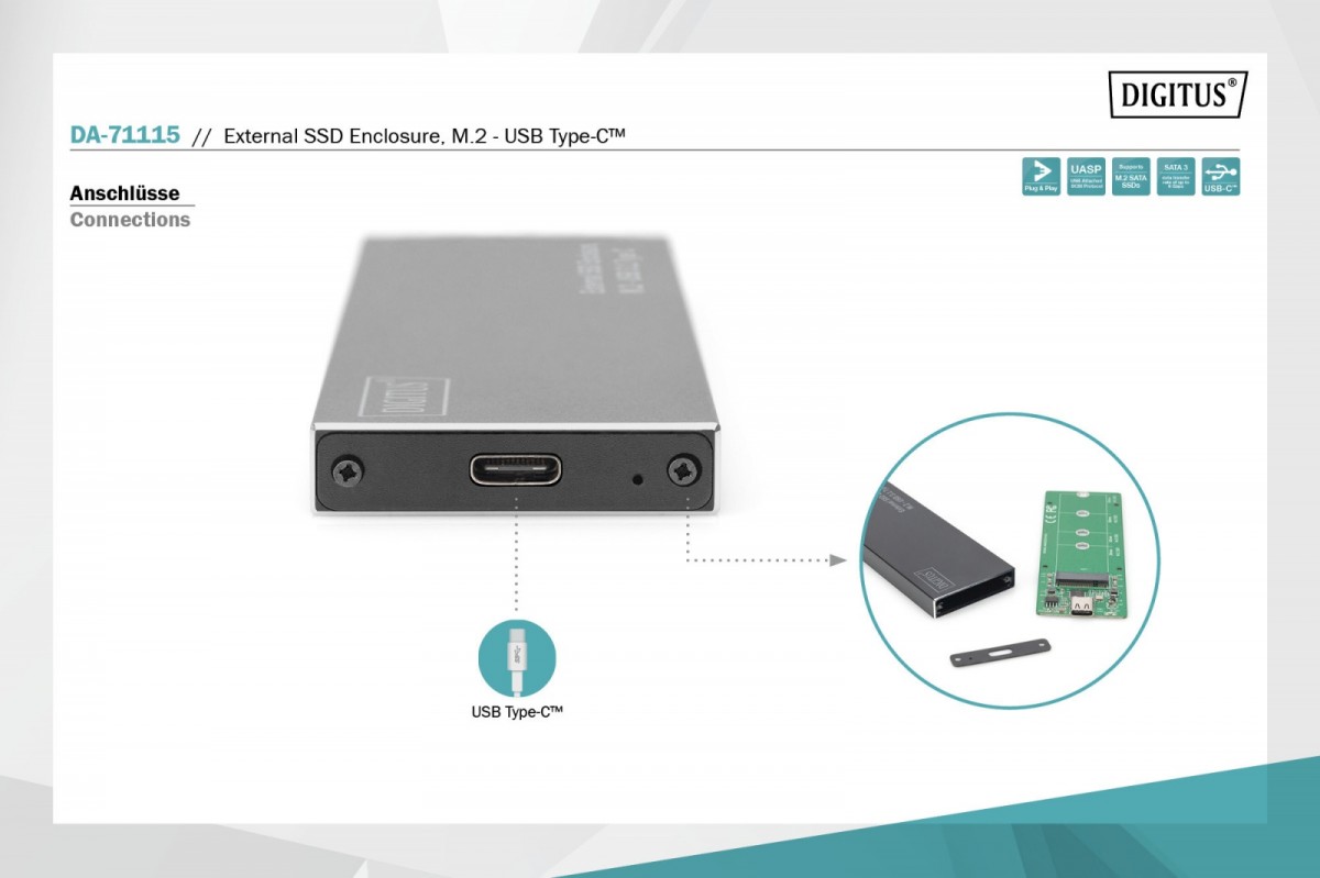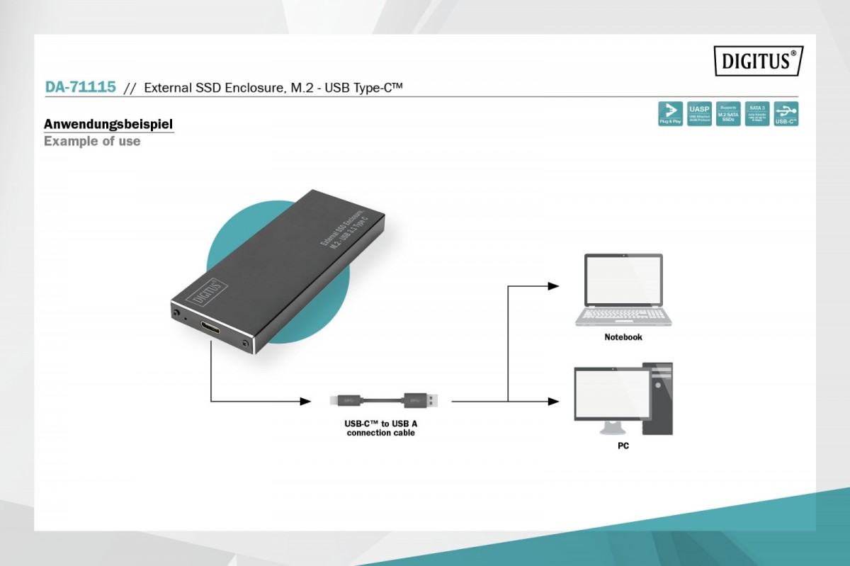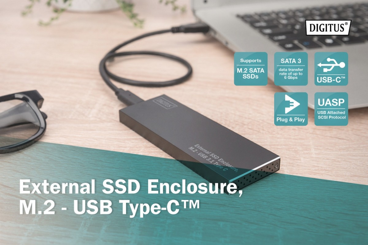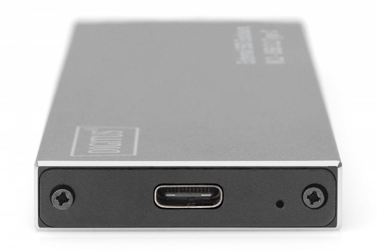 Obudowa dysku SSD umożliwia zewnętrzne podłączenie dysku SATA SSD M.2 przez port USB (C lub A) notebooka/komputera. Obsługa modułów M.2 typu: 2280 (80 mm), 2260 (60 mm), 2242 (42 mm) i 2230 (30 mm). Złącze M.2 SATA zapewnia dużą prędkość przesyłu danych do maks. 6 Gbit/s. Port USB 3.1 typu C gwarantuje prędkość przesyłu danych do 10 Gbit/s. Obudowa obsługuje także funkcję hot-plugging (możliwość podłączania lub odłączania urządzeń peryferyjnych przy włączonym zasilaniu) i Plug&Play. Smukła oraz stylowa obudowa z aluminium pozwala na komfortowe przenoszenie danych oraz ich szybki odczyt w każdym miejscu. Nie ma potrzeby stosowania dodatkowego zasilacza, zasilanie następuje poprzez port USB komputera/notebooka.